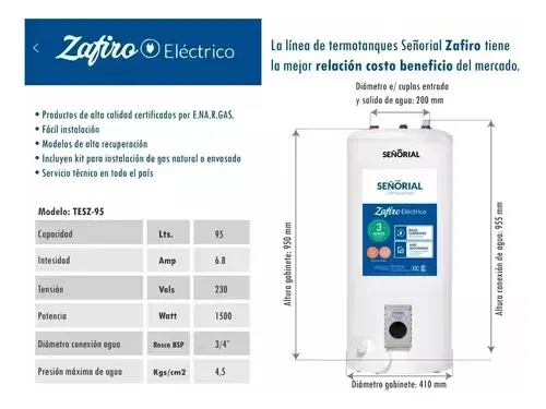 El termotanque eléctrico Señorial TESZ-95 posee una resistencia blindada que reduce el consumo y un interruptor térmico de seguridad que corta el circuito eléctrico en caso de excesivo calentamiento de agua. Además, cuenta con aislación térmica, para conservar el calor durante más tiempo y lograr el mayor ahorro de energía. Sistema de calentamiento