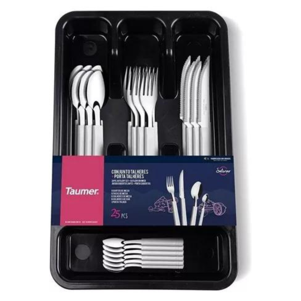 Descubre el elegante 'Set X 25 Cubiertos Organizador Taumer Saturno Acero Inox', ideal para cualquier ocasión. Este juego incluye 24 cubiertos de alta calidad y una práctica caja organizadora de plástico. Fabricados con acero inoxidable, estos cubiertos garantizan durabilidad y resistencia. Los mangos de polipropileno ofrecen un agarre cómodo y seguro. El set incluye 6 tenedores de 18 cm, 6 cuchillos serrucho de 19.5 cm, 6 cucharas de 18 cm y 6 cucharitas de 12.5 cm. Además, es apto para lavavajillas, facilitando su limpieza. La caja organizadora mide 32 x 21 x 4.5 cm, manteniendo tus cubiertos siempre ordenados. Perfecto para cualquier hogar, este set es nuevo y viene en un kit de fábrica. La línea Taumer Saturno combina funcionalidad y estilo en cada pieza.
