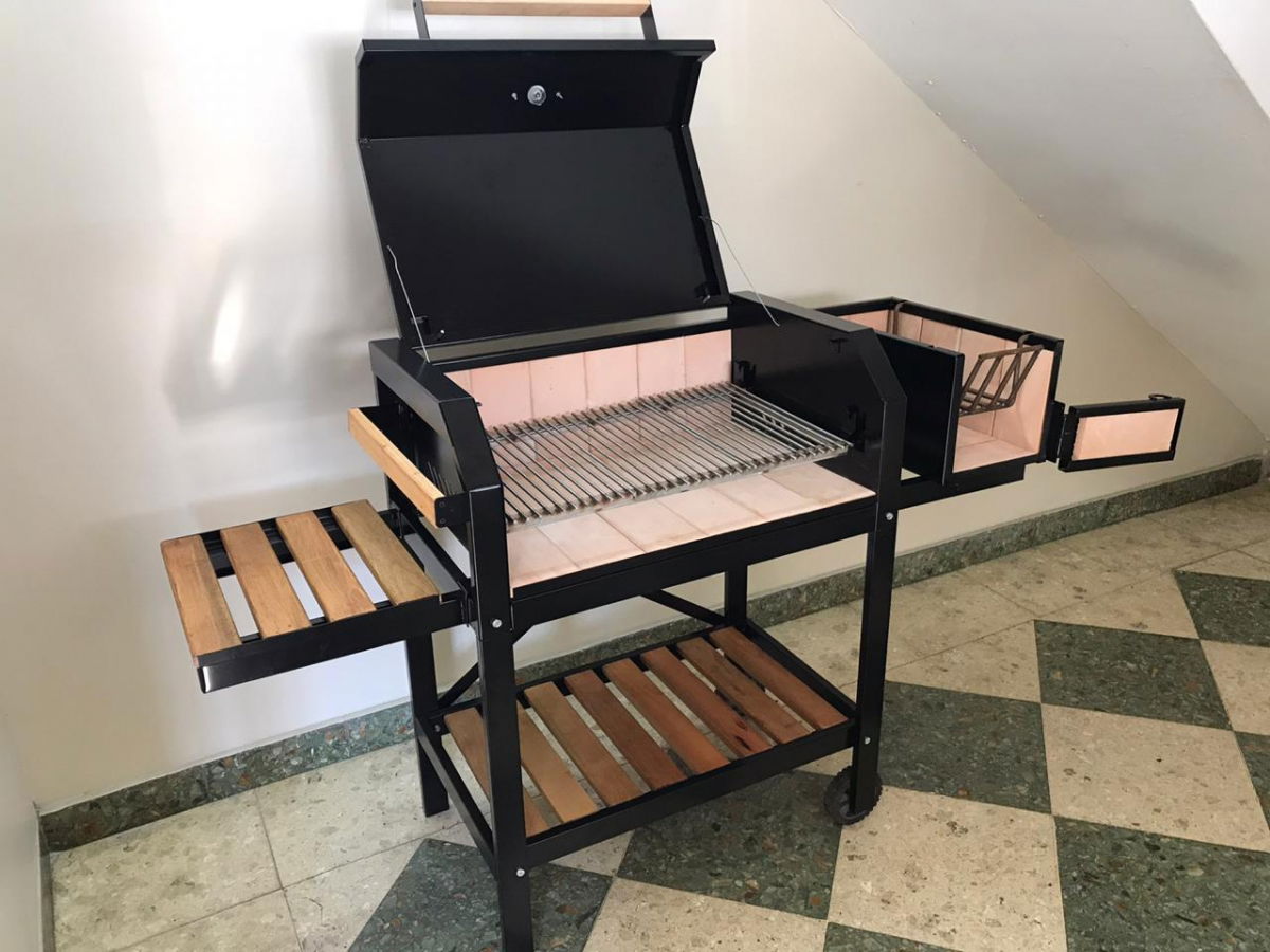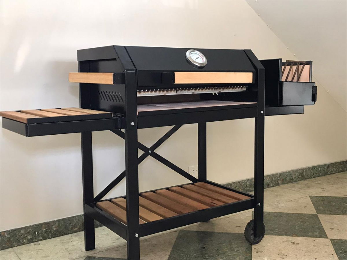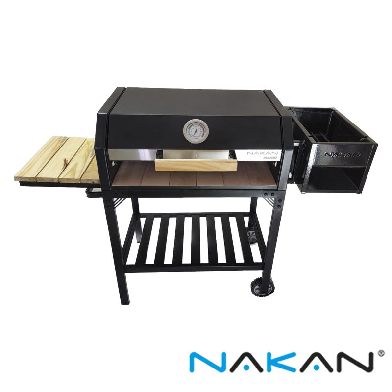 Parrilla NAKAN modelo MATRU viene revestido con ladrillos refractarios con tapa termostato brasero con tapa en un módulo separado brasero removible e intercambiable parrilla de acero inoxidable regulable a dos alturas para su limpieza módulo de parrilla encastrable sobre el brasero para cocinar directo sobre la llama con rueda y manija para transportar, con estante lateral removible e intercambiable estante inferior para guardar.
