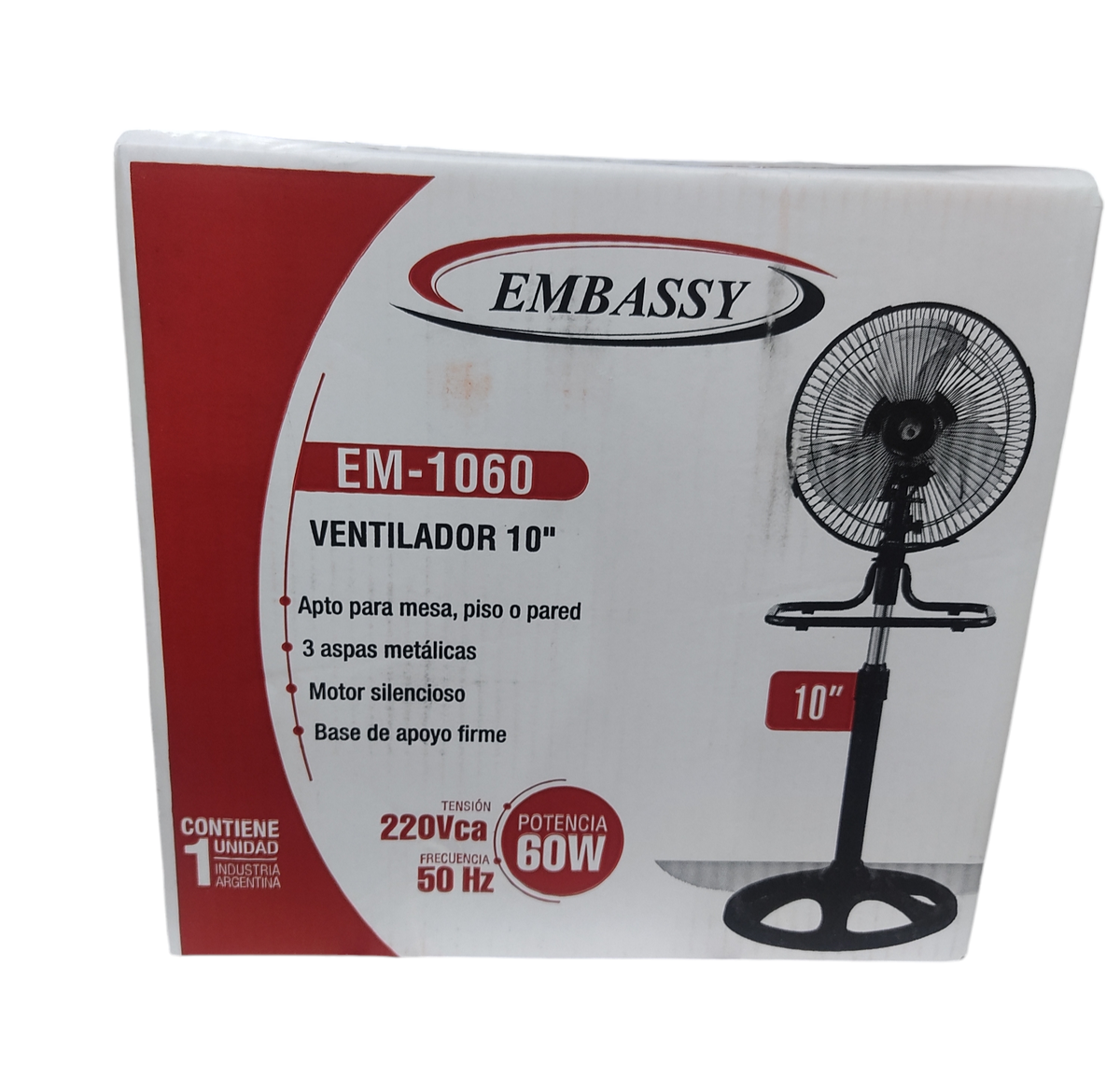 El ventilador Embassy EM‑1060 10″ 3 en 1 (pie, mesa o pared) no posee una etiqueta oficial de eficiencia energética (A, B, C, etc.), ya que este tipo de ventiladores no está regulado bajo normativas que exijan dicho etiquetado en Argentina