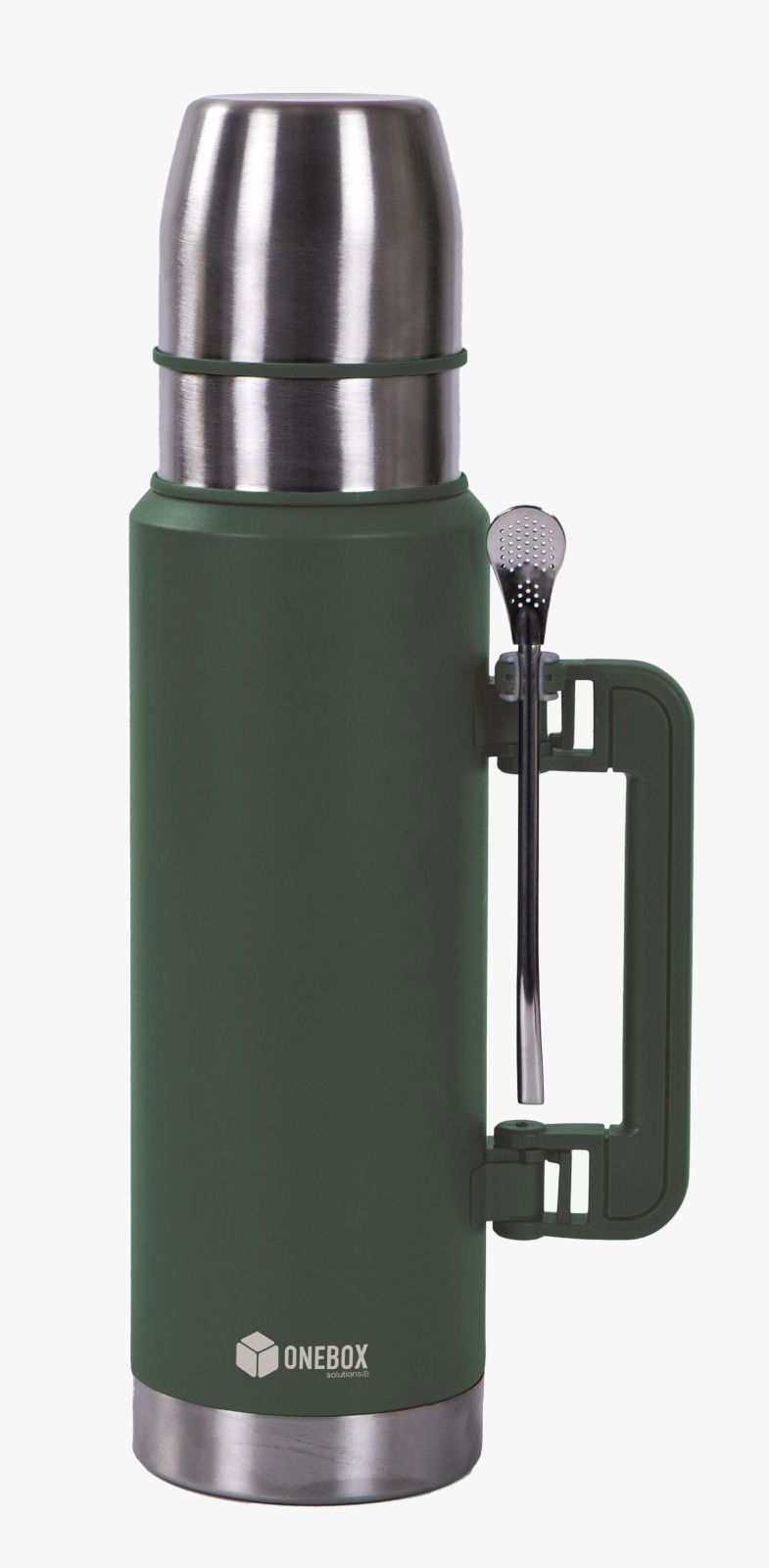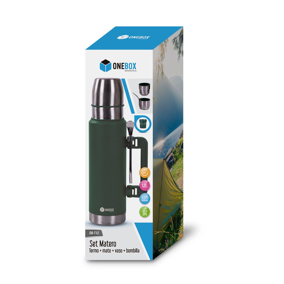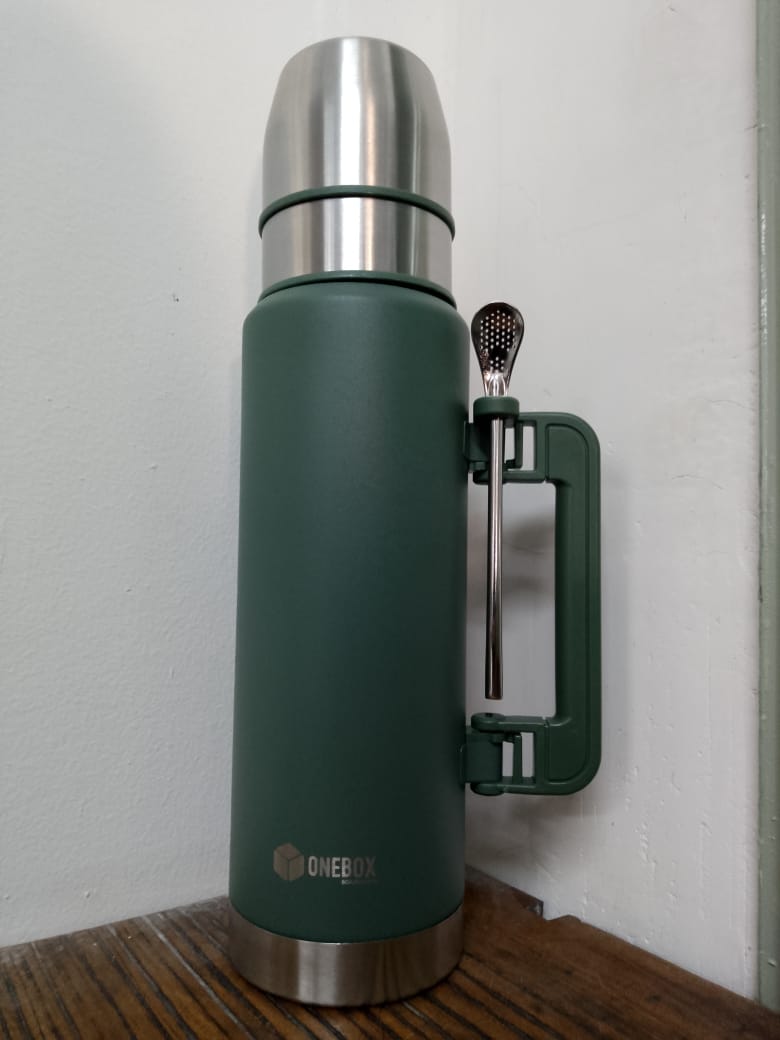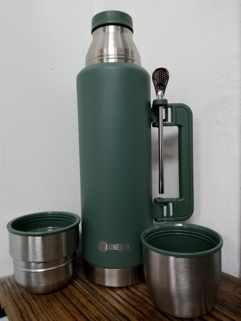 Termo de acero inoxidable de doble pared de 1,2L con porta bombilla. - Incluye Termo + Vaso + Mate + Bombilla + Pico vertedor - Frío/Calor 24 hs - Color Verde o Negro.