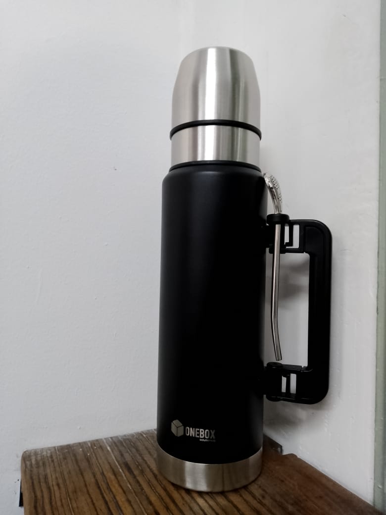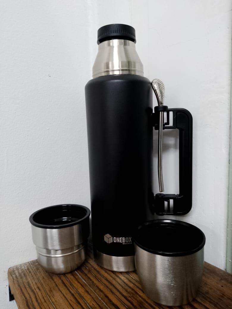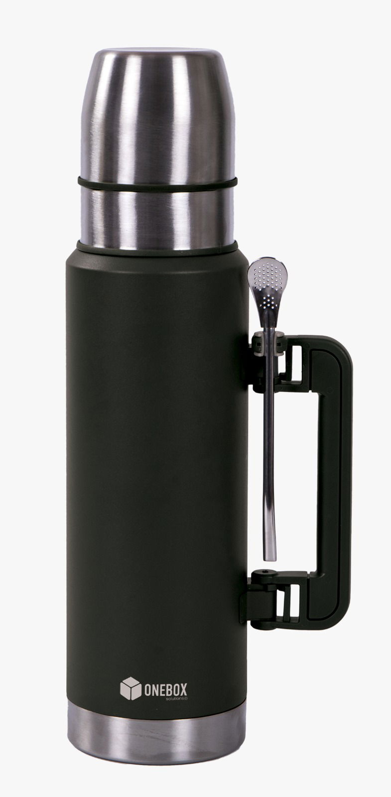 Termo de acero inoxidable de doble pared de 1,2L con porta bombilla. - Incluye Termo + Vaso + Mate + Bombilla + Pico vertedor - Frío/Calor 24 hs - Color Verde o Negro.