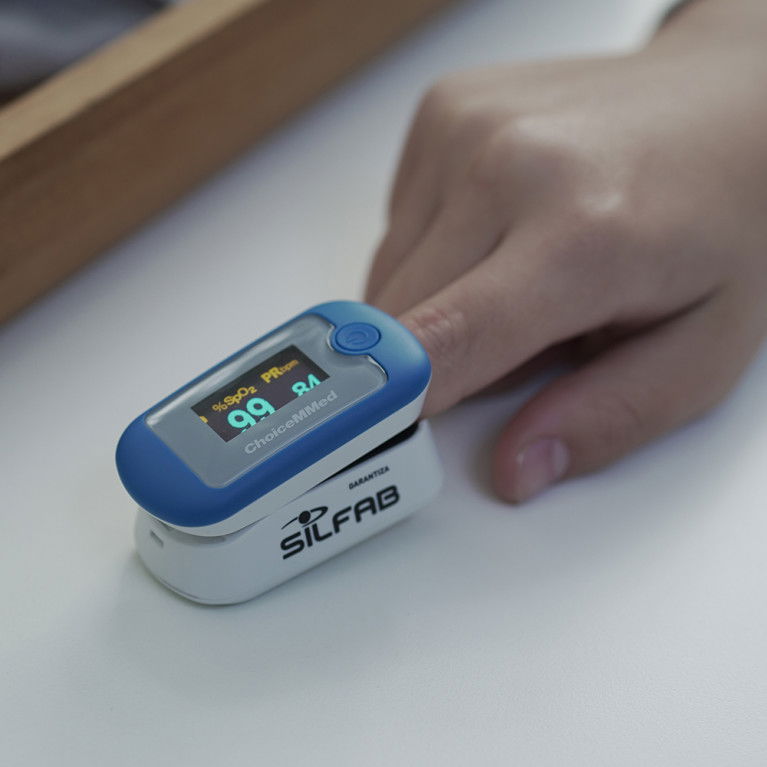 Oxímetro de Pulso Standard. Marca Silfab. Modelo MD300CN330. Mide: Saturación de oxígeno en sangre, frecuencia del pulso e índice de perfusión. Onda pletismográfica. Las fotografías y gráficas son meramente ilustrativas. Los productos podrán sufrir modificaciones en sus accesorios y/o colores sin previo aviso.