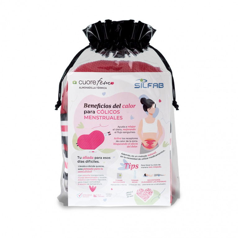 Almohadilla Térmica FEM. Con funda desmontable y lavable. Con estuche transportable. Elástico con hebilla regulable. Las fotografías y gráficas son meramente ilustrativas. Los productos podrán sufrir modificaciones en sus accesorios y/o colores sin previo aviso.