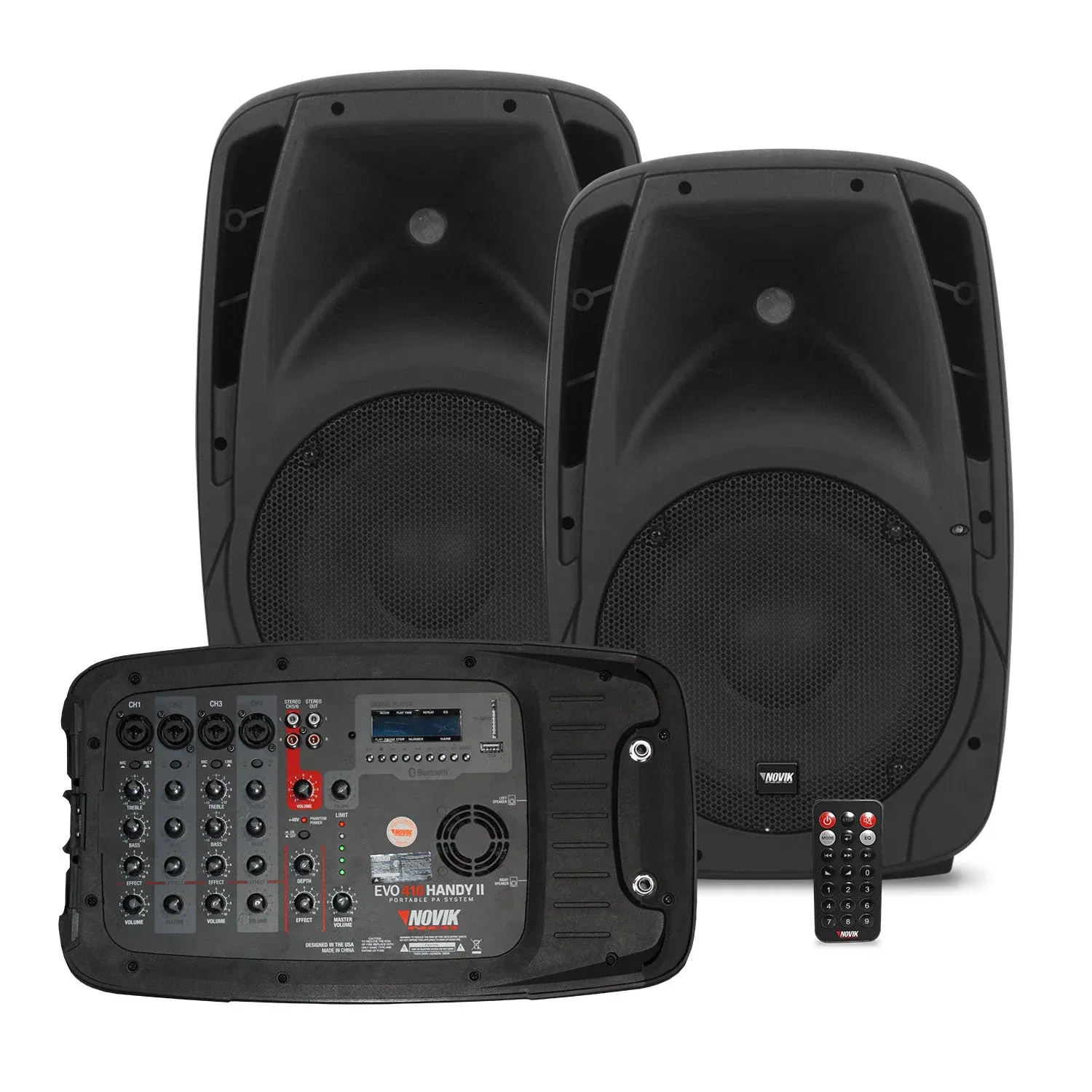 Evo 410 Handy II de Novik es el nuevo sistema de sonido todo en uno para amplificar el mejor audio en tu casa o patio. Este sistema cuenta con dos parlantes pasivos que entregan una potencia de 150w rms cada uno, una consola potenciada con 4 canales para micrófono o instrumento, ecualizador por canal y conector RCA. Además, incluye micrófono con cable, cables para conectar los parlantes a la consola y control remoto.