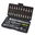Incluye una llave de apriete regulable, tubos de diferentes medidas, puntas de destornillador de varios tipos (Phillips, Pozidriv, Allen, Torx, planos), extensiones y adaptadores.