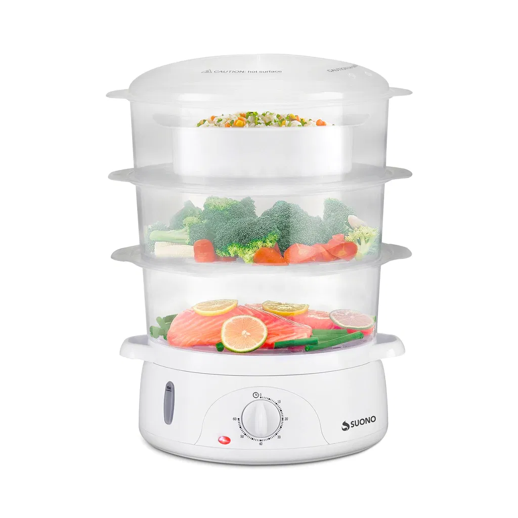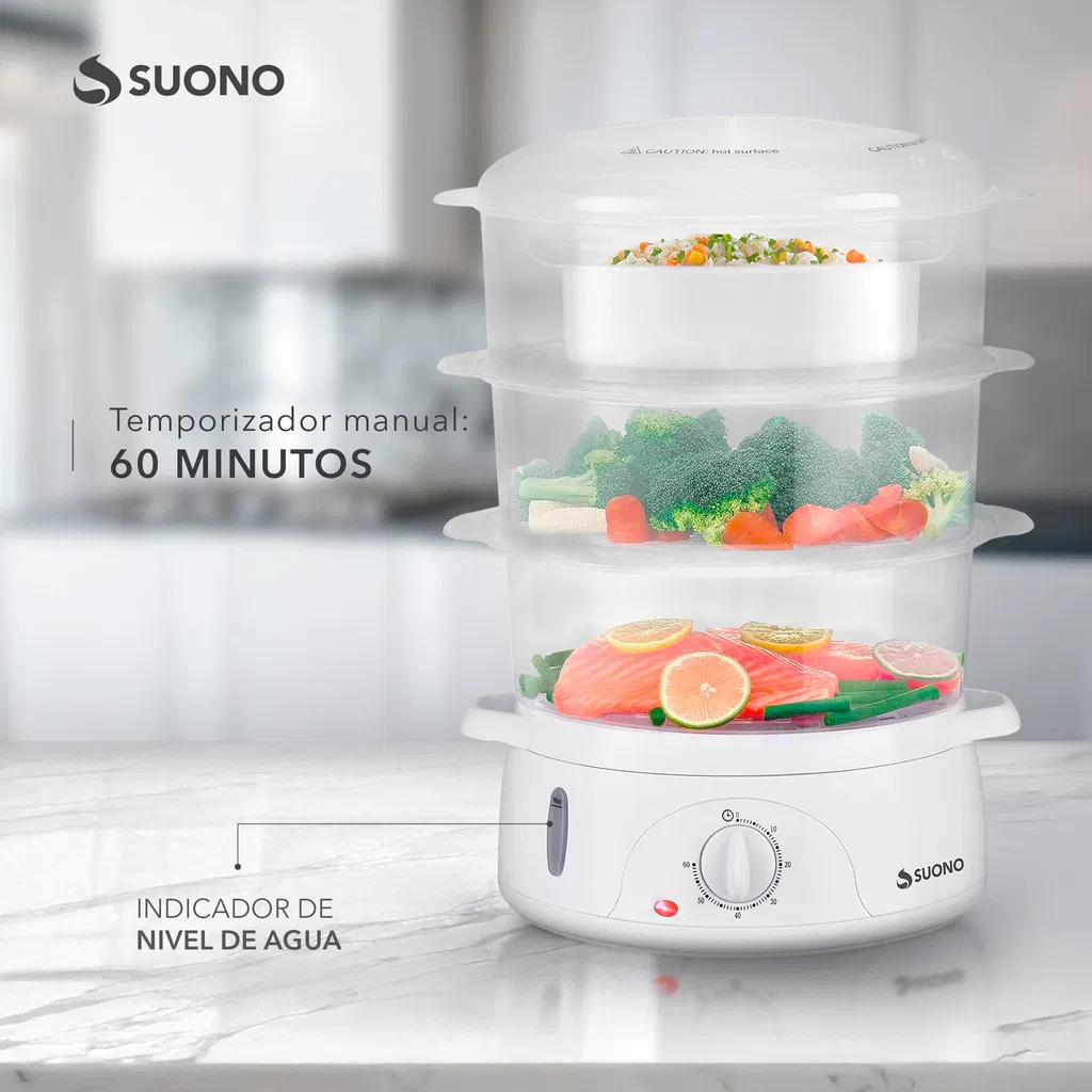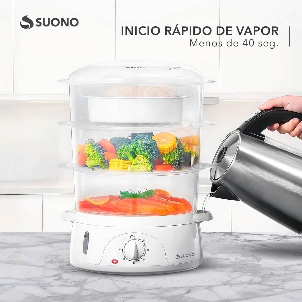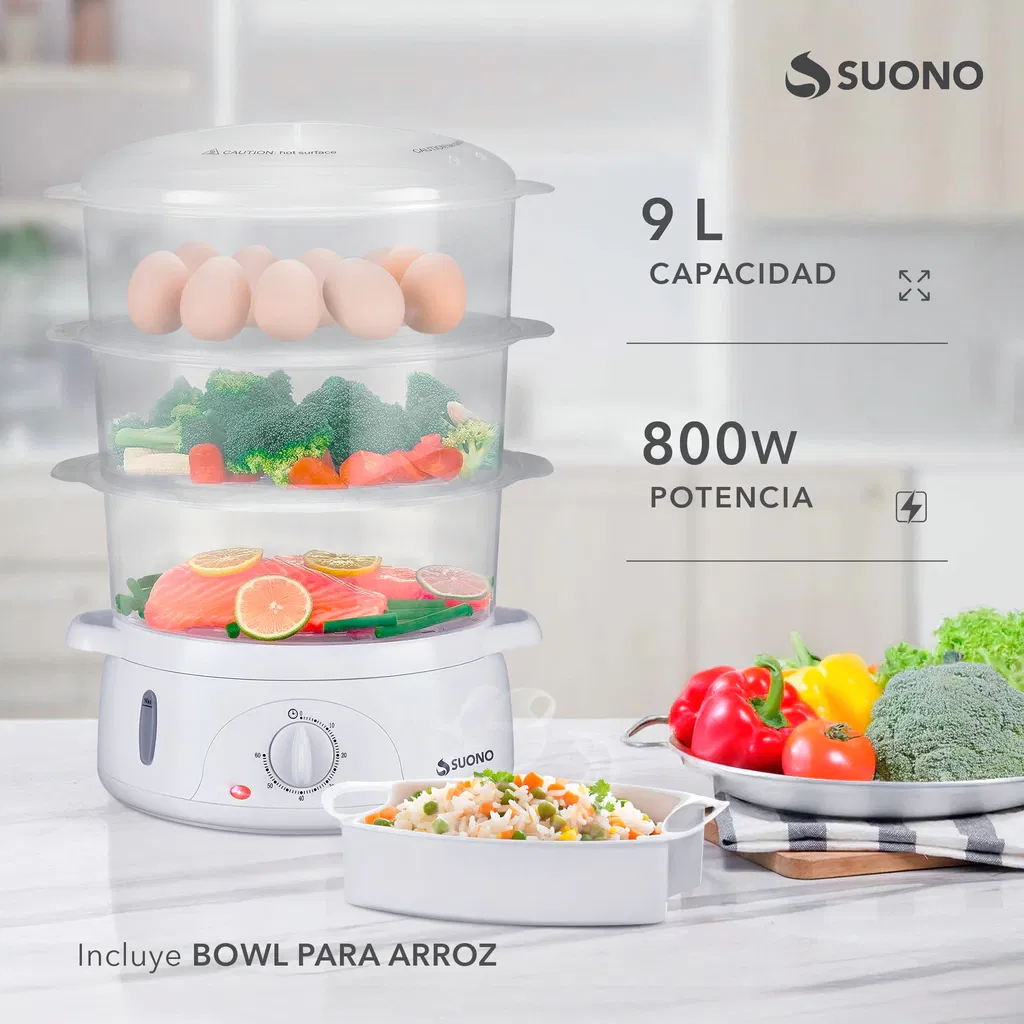 La Vaporera de Alimentos 800W es ideal para quienes buscan una forma saludable y práctica de cocinar, preservando los nutrientes, el sabor y la textura natural de los alimentos. Con 3 recipientes apilables y una capacidad total de 9 litros, permite preparar varios alimentos al mismo tiempo. Su inicio rápido de vapor y temporizador manual facilitan una cocción eficiente y sin complicaciones.