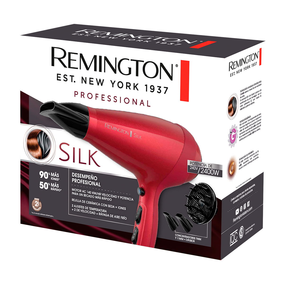 cabello profesional con tecnología avanzada SILK Ceramic funciona hasta 50% más rápido* gracias al motor de 2400 W. El revestimiento de cerámica avanzada en la rejilla del secador genera un 90% más de iones* para darle un acabado suave y sedoso libre de frizz. Además, incluye dos cabezales de fijación: un concentrador para un estilo de precisión y un difusor para mantener los rizos y la textura.
