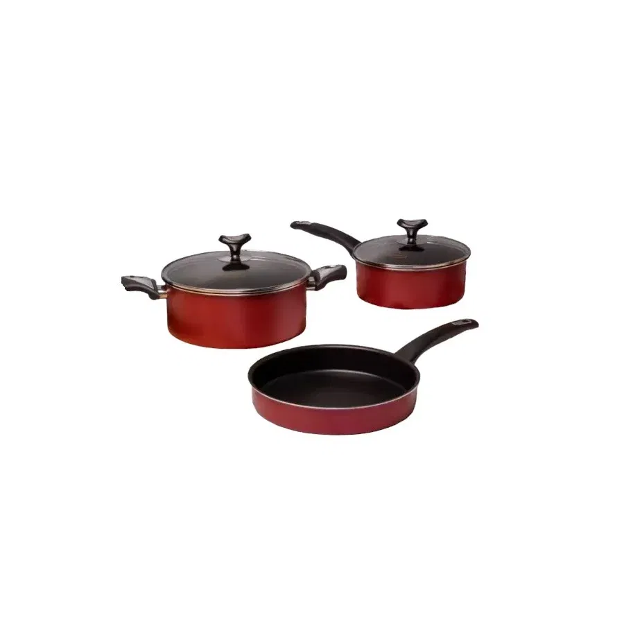 Set de 2 cacerolas y 1 sartenes de aluminio de primera calidad. Antiadherente interior y exterior. Asas y mangos de baquelita negra con insertos de ABS color plata, con paraflamas y platillo de perilla en acero inoxidable. Tapas de vidrio termoresistentes