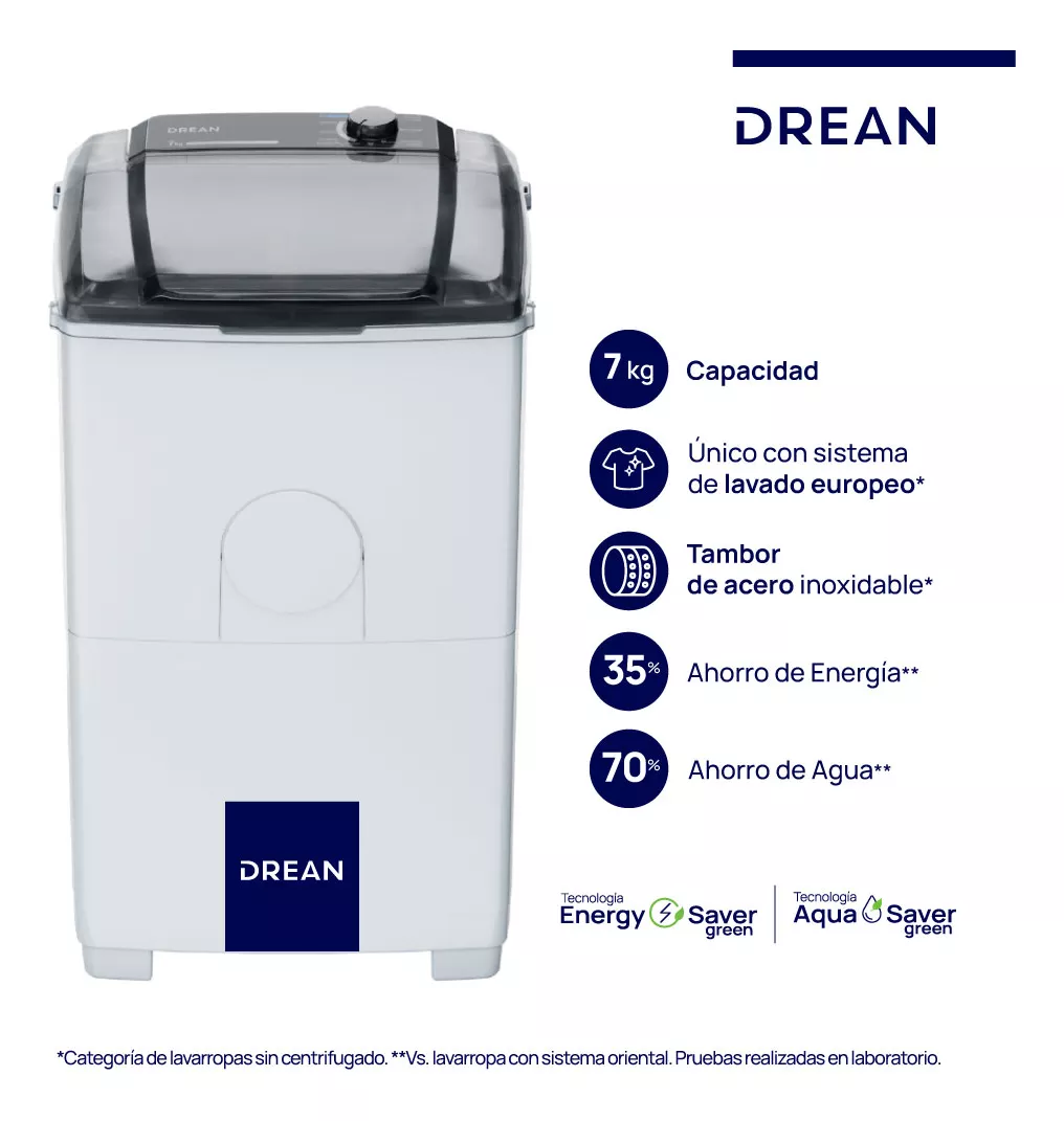 Lavarropas semiautomático de carga superior. Color blanco. Capacidad de lavado de 7 Kg. Posee 9 programas de lavado. Sistema de lavado europeo. Comando superior. Cuenta con tapa transparente. Tambor de acero inoxidable. Dispenser de detergente y suavizante. Sin centrifugado. Origen Argentina.