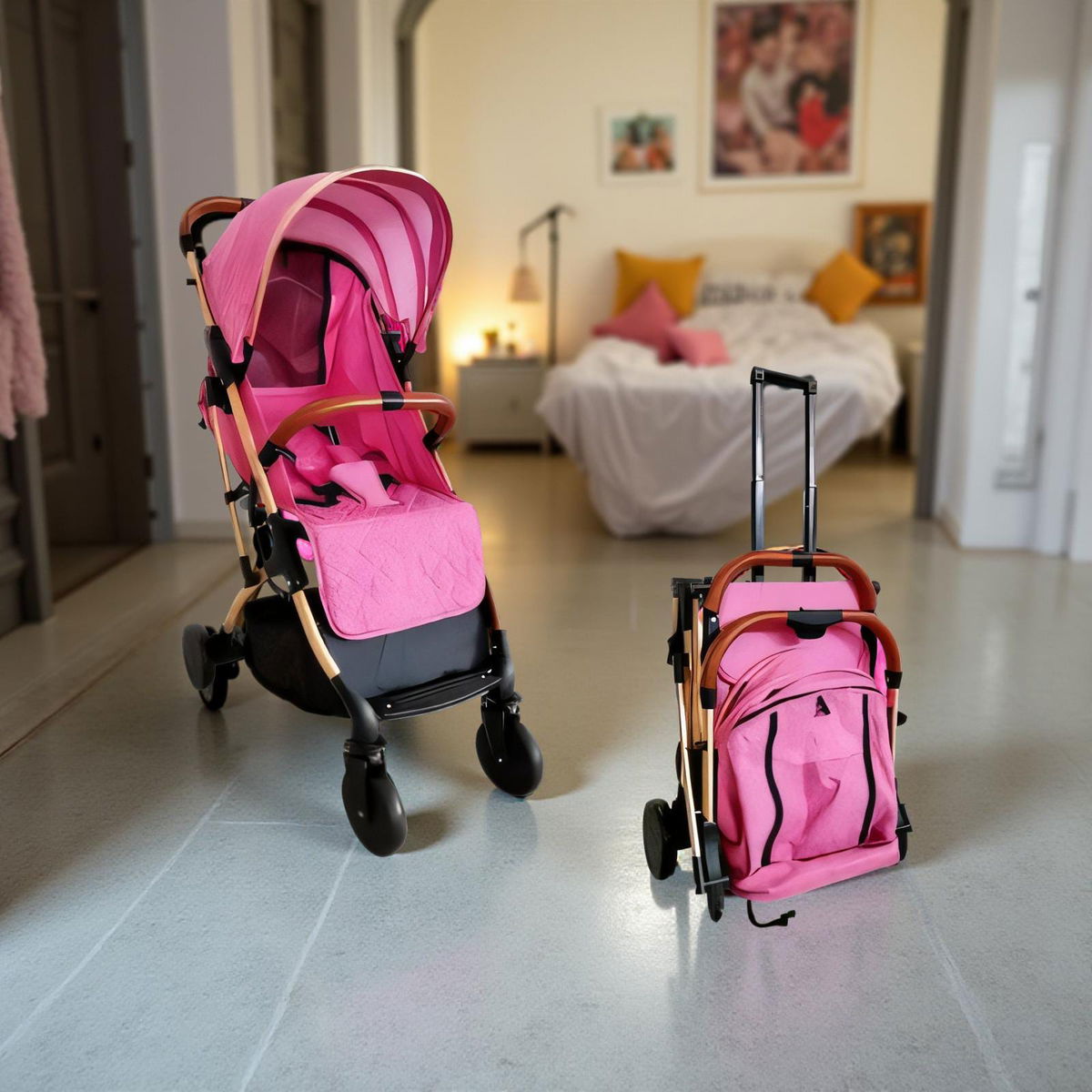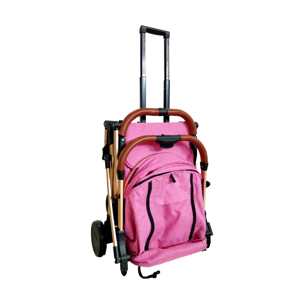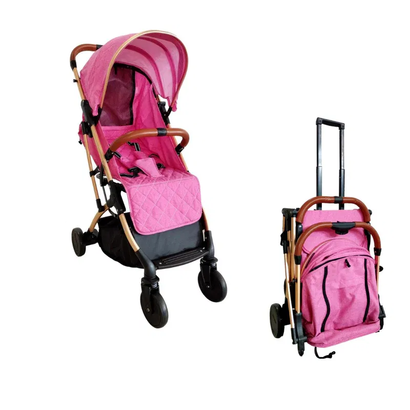 Coche Sistema Valija. Plegado total. Reclinable. Ruedas con frenos traseros. Bandeja baja guarda cosas. Capota expandible. Cinturón de seguridad. Barra frontal. Incluye porta vasos y Bolso de traslado. Materiales: Tubos de Aluminio, Tela de Lino 300D, Piezas de Plástico, Ruedas de Eva.