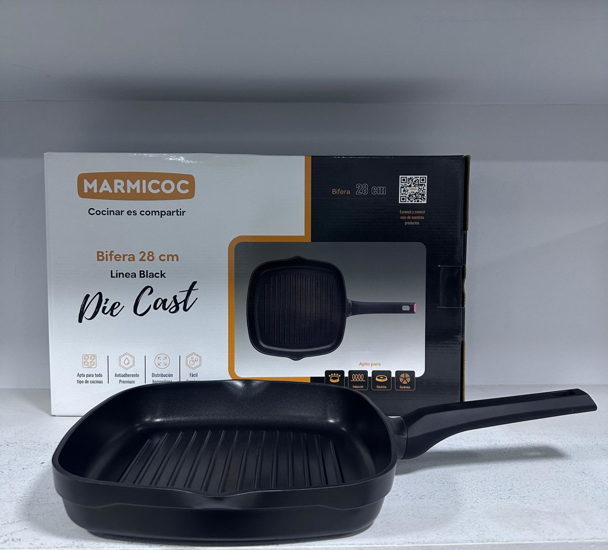 Bifera 28 cm de aluminio de alta densidad, apto todo tipo de cocinas (gas, eléctrico, inducción, cerámica) . Mango de baquelita con recubrimiento soft touch. Pico vertedor. Aleación de aluminio multicapas. Recubrimiento interior antiadherente bicapa, exterior silicona. Distribución homogénea del calor. Fácil limpieza.